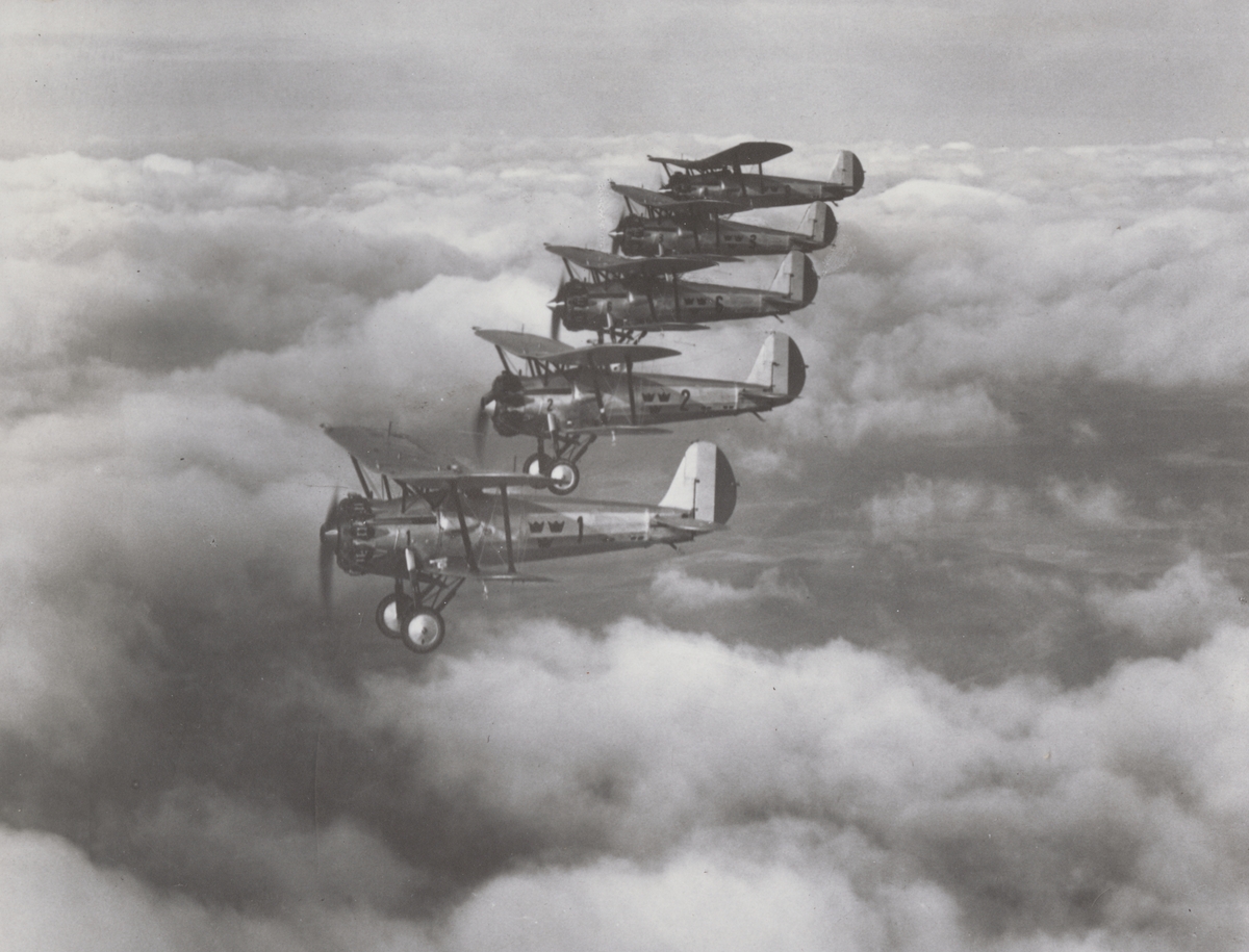 Fem flygplan J 7 Bristol Bulldog flyger i formation ovan moln. Vid Skånemanövern, september 1935. Flygplan från F 1 Västerås, märkta nummer 1, 2, 6, 3 och 8.
