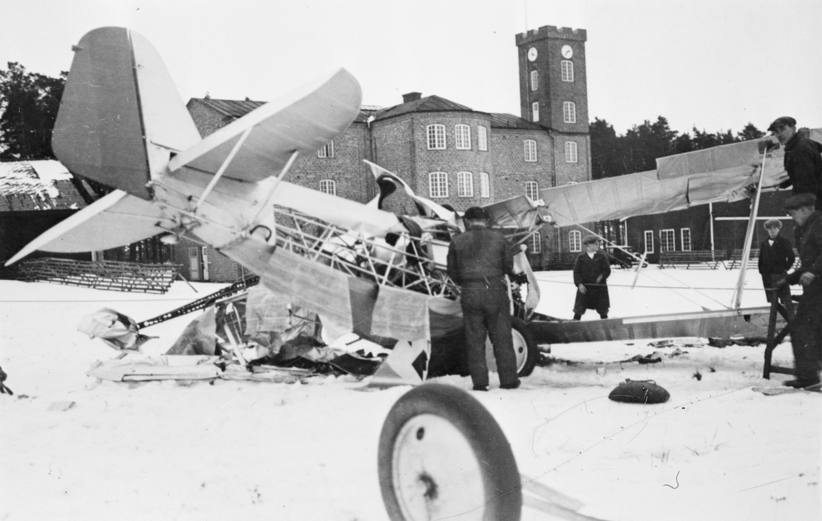 Arbete kring ett havererat flygplan J 6 på Centrala flygverkstäderna Malmslätt, 1931.
