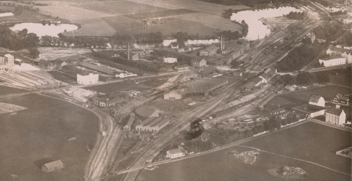 Flygfotografi av järnvägsräls i Linköping, 1914.