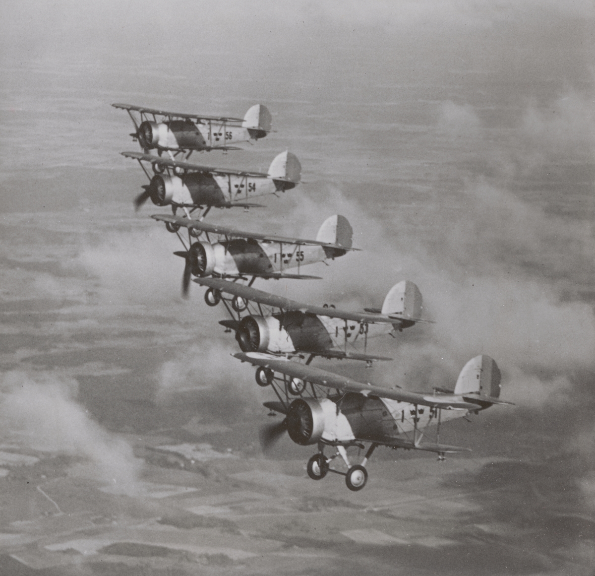 Fem flygplan B 4, Hawker Hart tillhörande F 1 Västmanlands flygflottilj flyger i formation. Lätta moln och landskap i bakgrunden. Flygplan märkta F 1-51, F 1-53, F 1-54, F 1-55 samt F 1-56. Flygbild snett uppifrån.