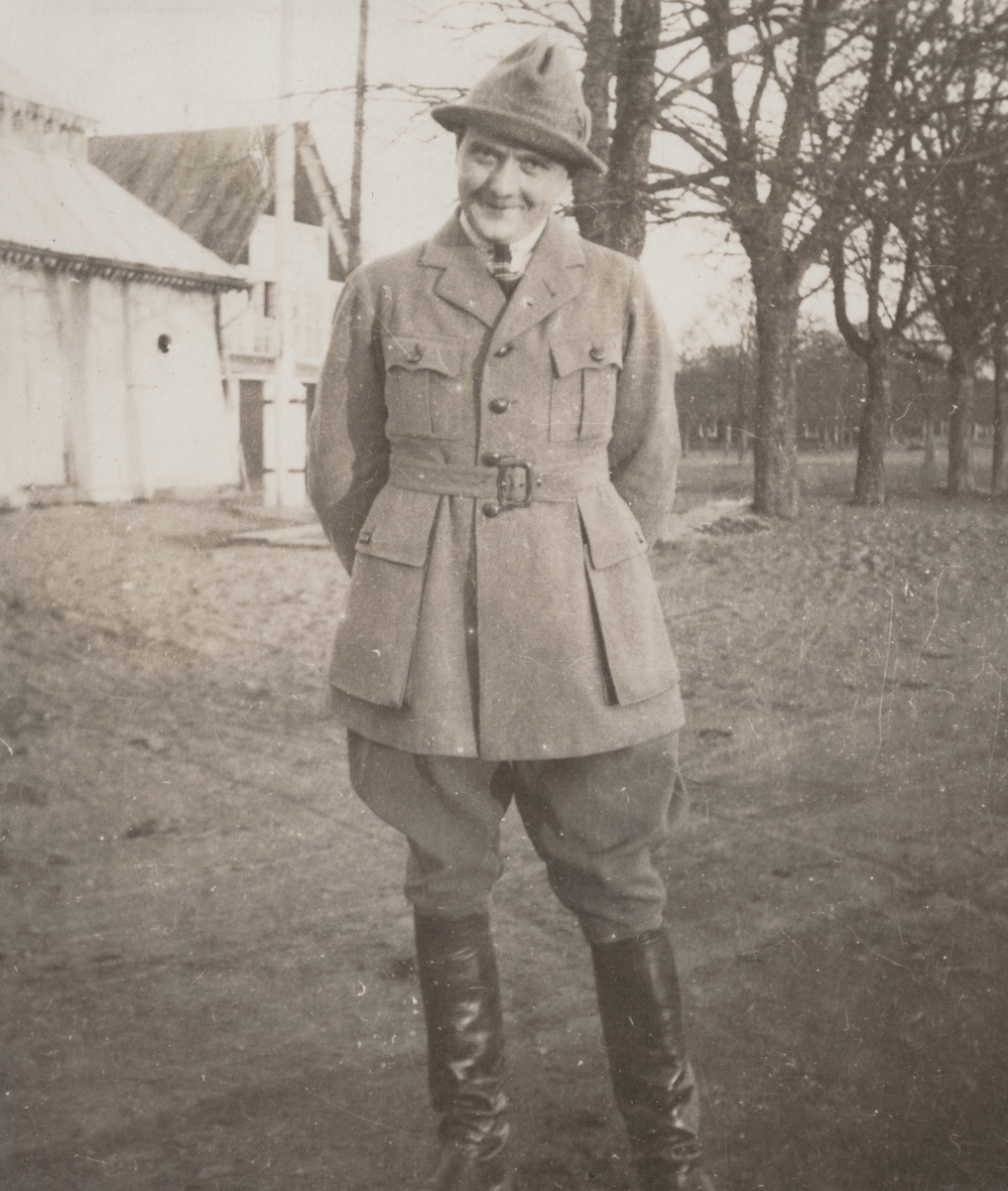 Porträttfoto av militären Nils Kindberg framför byggnad på Malmen, 1924.