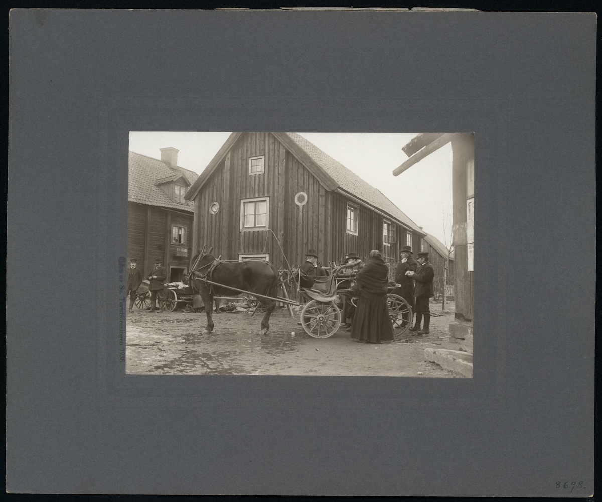Hjuldon för åktransport. Östergötland. Bankekinds hd. Åtvids sn. Åtvidaberg. Baroniet Adelswärd. "Färdiga att resa från marknaden". J.E. Thorin foto . 29. 3. 1902. Autodidakt. Svenska Turistföreningens Fotografiska Pristäflan 1902 3.e Pris.