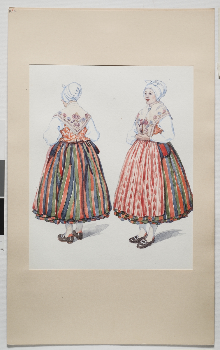 Högtidsdräkt för kvinnor, Östervallskogs socken, Värmland. Akvarell av Emelie von Walterstorff.