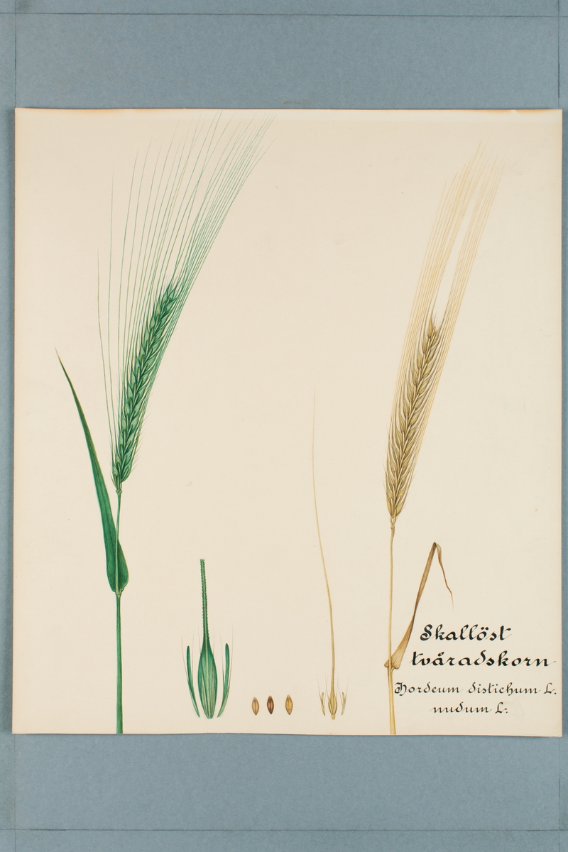 Sveriges kulturväxter. Illustration utförd av Henriette Sjöberg. Korn, tvåradigt, skallöst. Odlingsplats och datering saknas.