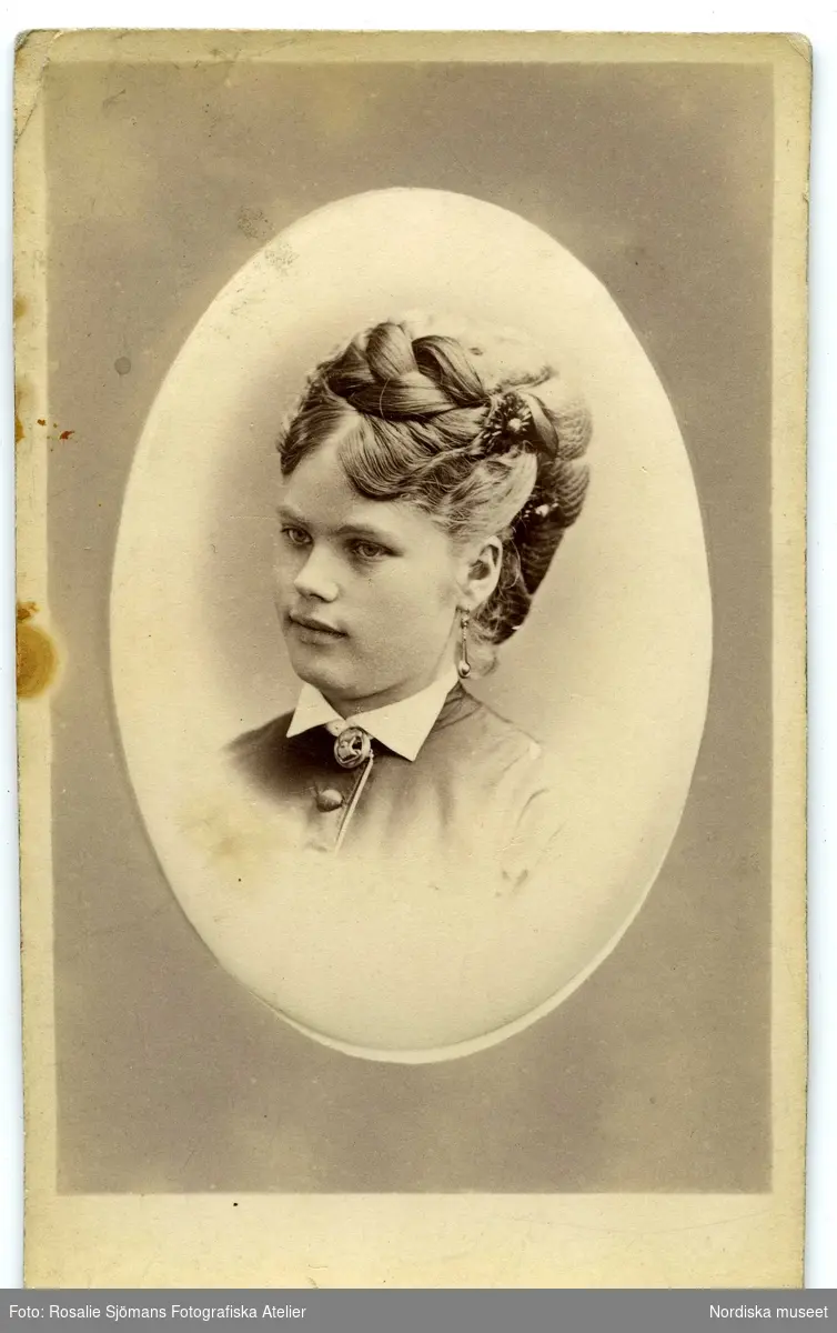 Ung kvinna med konstfull frisyr med blomformade hårsmycken, örhängen och brosch. 1870-tal.