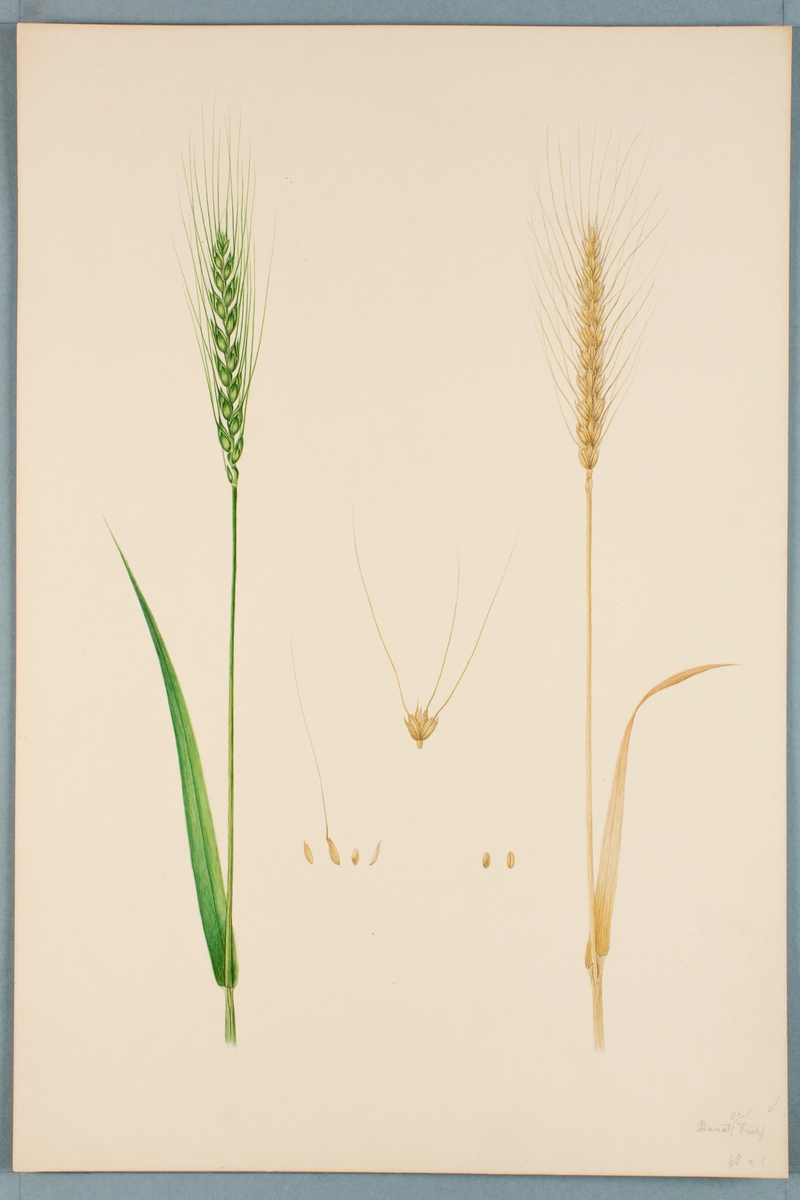 Sveriges kulturväxter. Illustration utförd av Henriette Sjöberg. Vete, utan namn. Odlat Experimentalfältet 1892. Signerad "H.S. 1882. Exper.". Påskrift med blyerts på framsidan: Banater Früh/.../