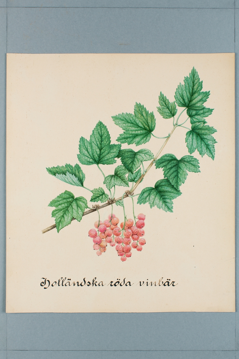 Sveriges kulturväxter. Illustration utförd av Henriette Sjöberg. Holländska, röda vinbär. Odlingsplats och datering saknas.