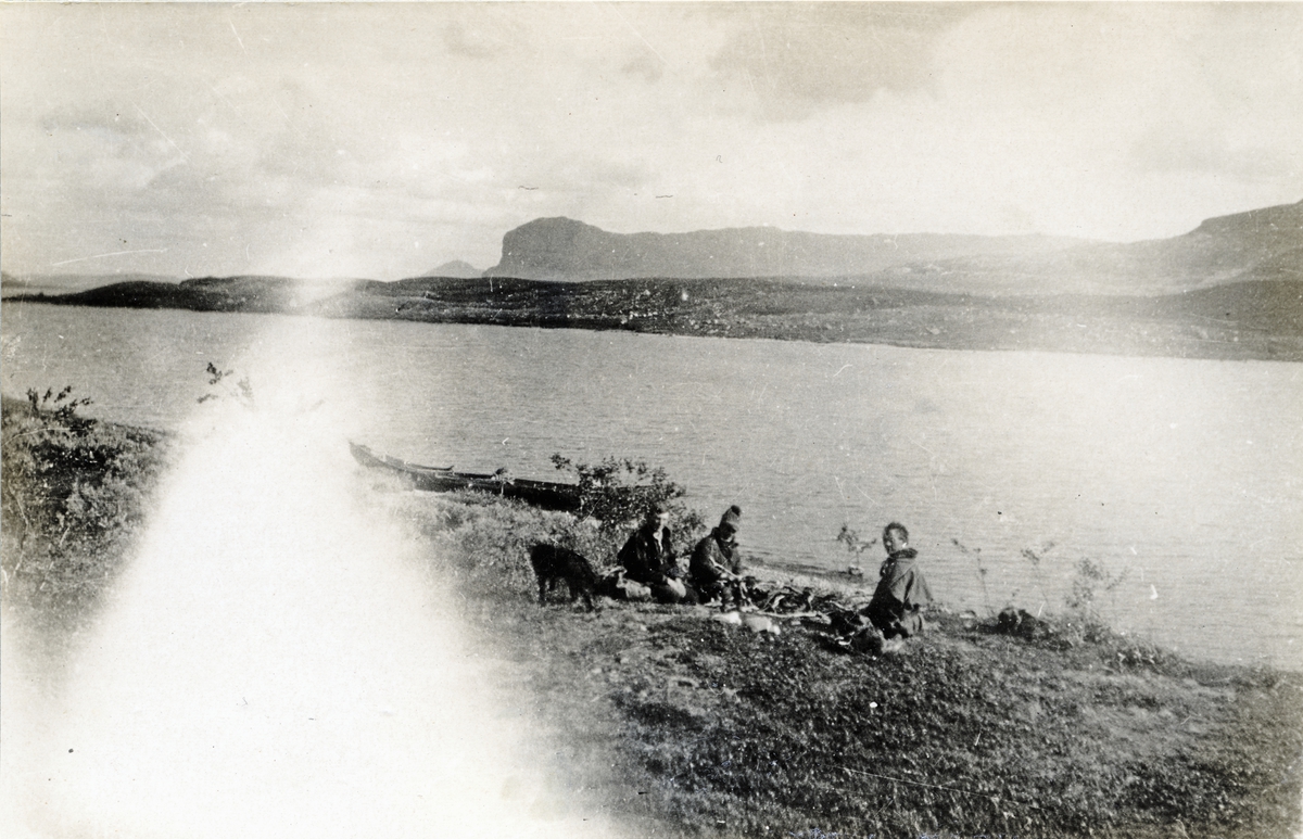 Rast under båtfärd på Paijeb-Kaitumsjön med samer från Tjuonajokk. Tre män och en hund vilar vid strandkanten.