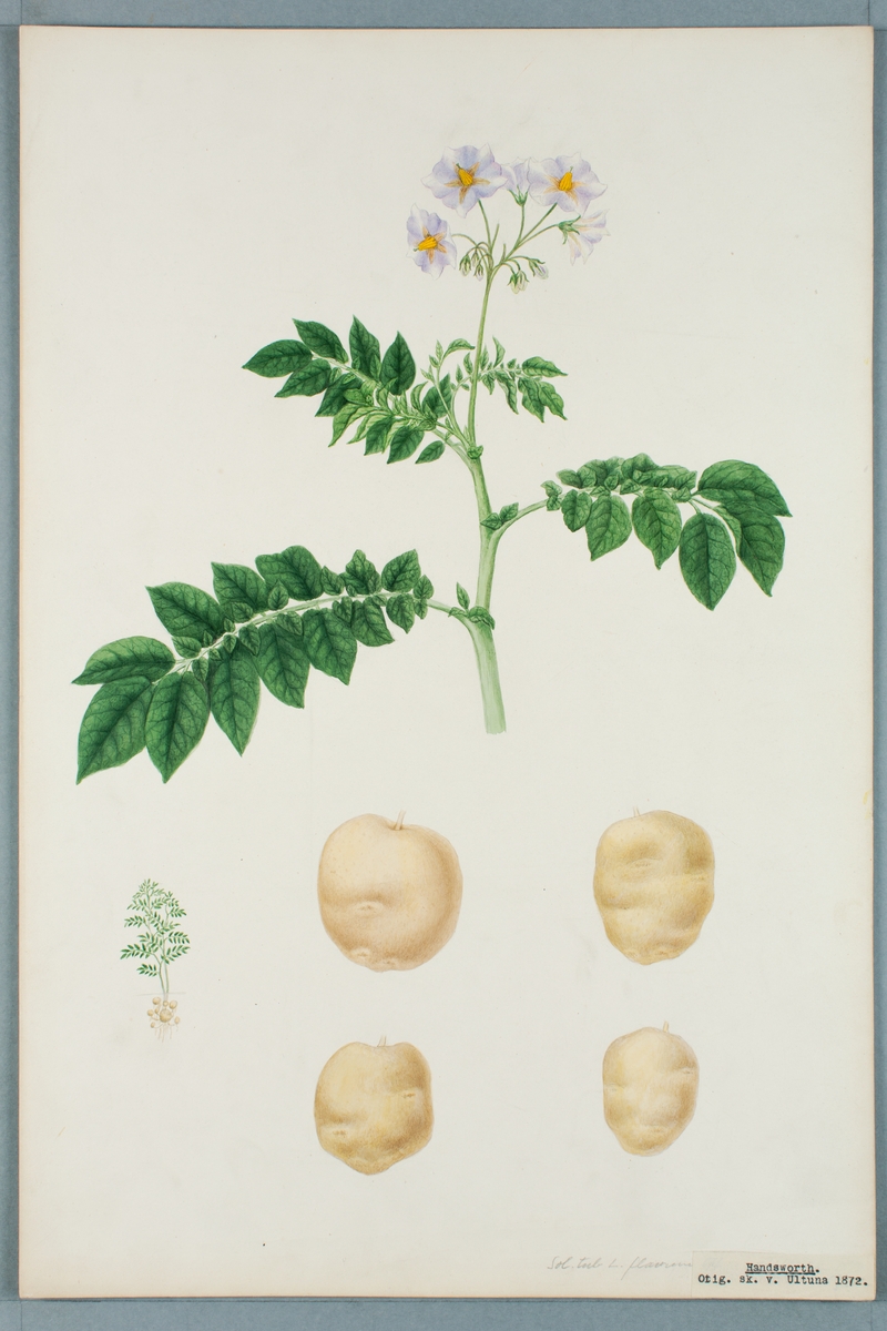 Sveriges kulturväxter. Illustration utförd av Henriette Sjöberg. Potatis, vitgul, Handsworth. Odlad Ultuna 1872. Inv. nr. C101 : 322.