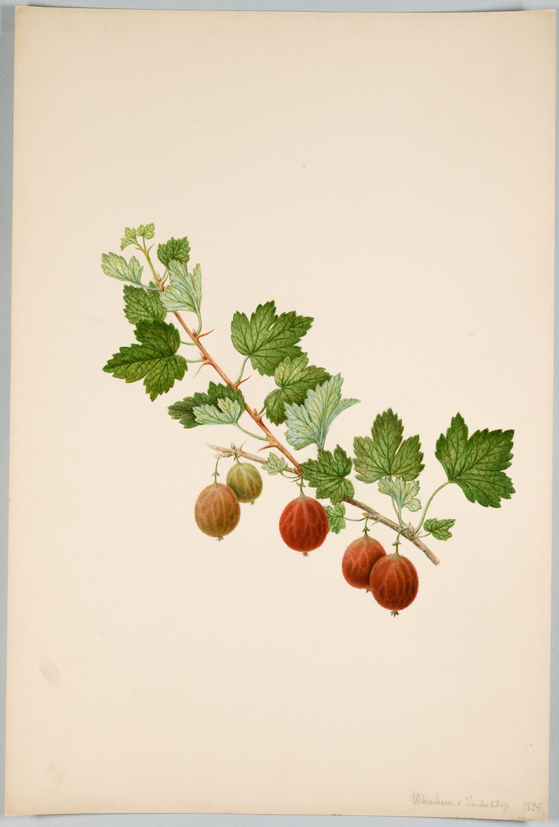 Sveriges kulturväxter. Illustration utförd av Henriette Sjöberg. Krusbär, röda. På framsidan påskrift med blyerts "Whinham's Industry 1894". Troligen odlade Rosendal. I Kungliga Skogs och Lantbruksakademiens (KSLA) bibliotek (stämplad på baksidan). Signerad "H.S. 1894. Rosendal".