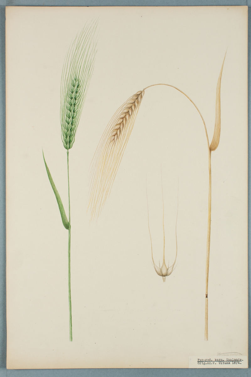 Sveriges kulturväxter. Illustration utförd av Henriette Sjöberg. Korn, fyrradigt, Upplands. Odlat Ultuna 1874.