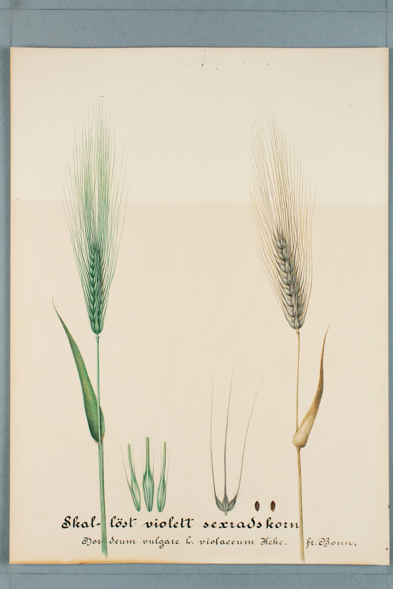 Sveriges kulturväxter. Illustration utförd av Henriette Sjöberg. Korn, sexradigt, skallöst, violett. Odlat Experimentalfältet 1887. Signerad "Henriette S.g 1887 Exper fält.". Jämför NMA.0098649.