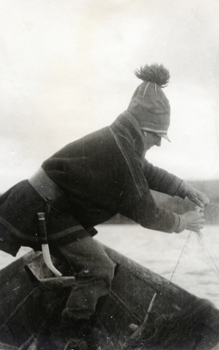 Anders Saitun tar upp nät i Tjuonajokk, Norrkaitum, Gällivare socken, Lappland.
