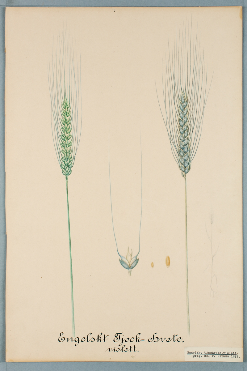 Sveriges kulturväxter. Illustration utförd av Henriette Sjöberg. Vete, Tjockvete, engelskt violett. Odlat Ultuna 1875. Inv. nr. C101 : 104.
