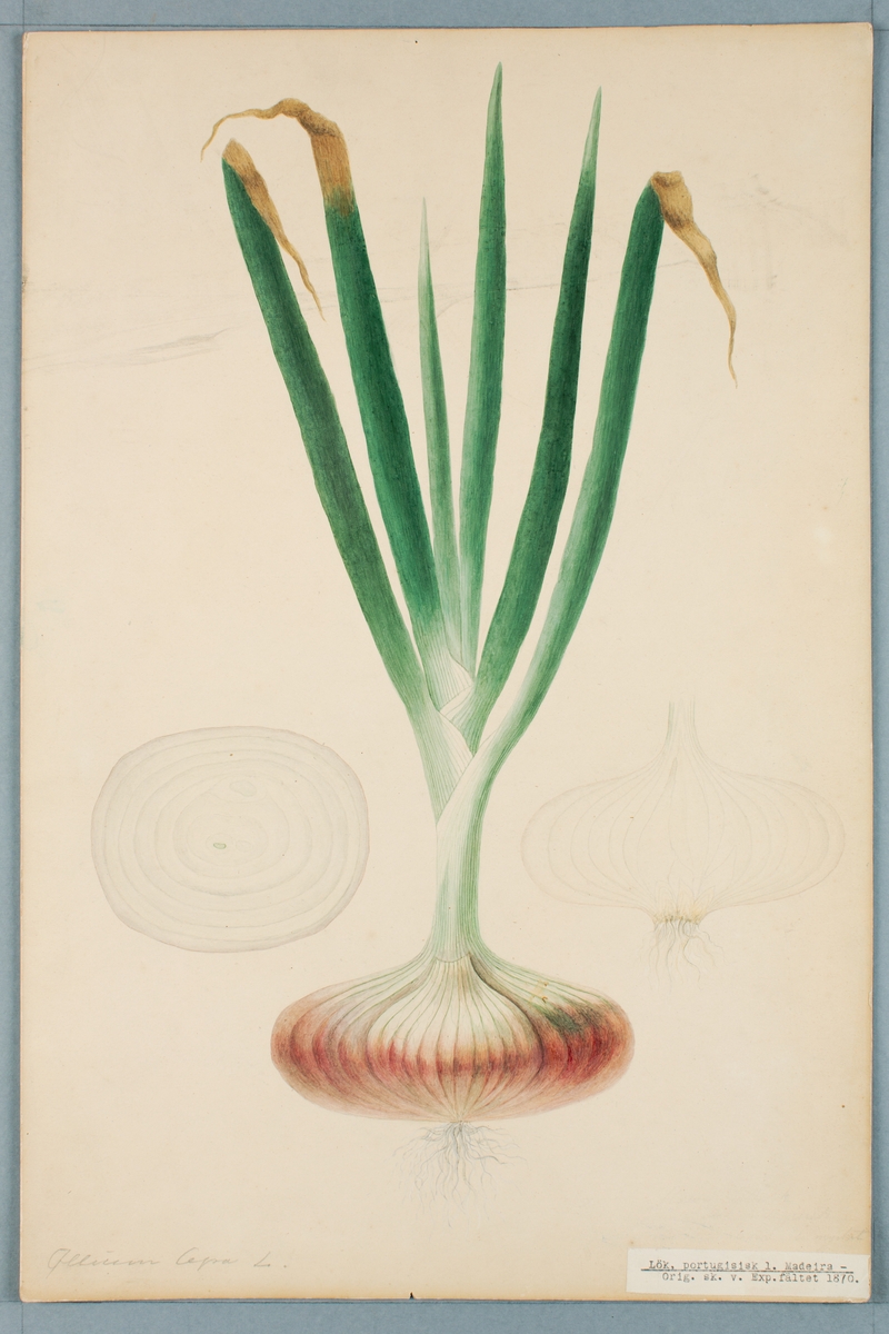 Sveriges kulturväxter. Illustration utförd av Henriette Sjöberg. Lök, Madeira/Portugisisk. Odlad Experimentalfältet 1870. Inv. nr. C101 : 530.