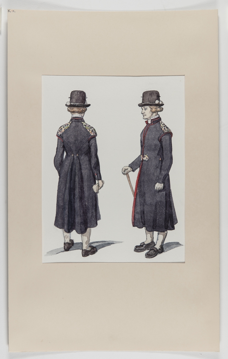 Högtidsdräkt för man Leksand Socken, Dalarna. Akvarell av Emelie von Walterstorff.