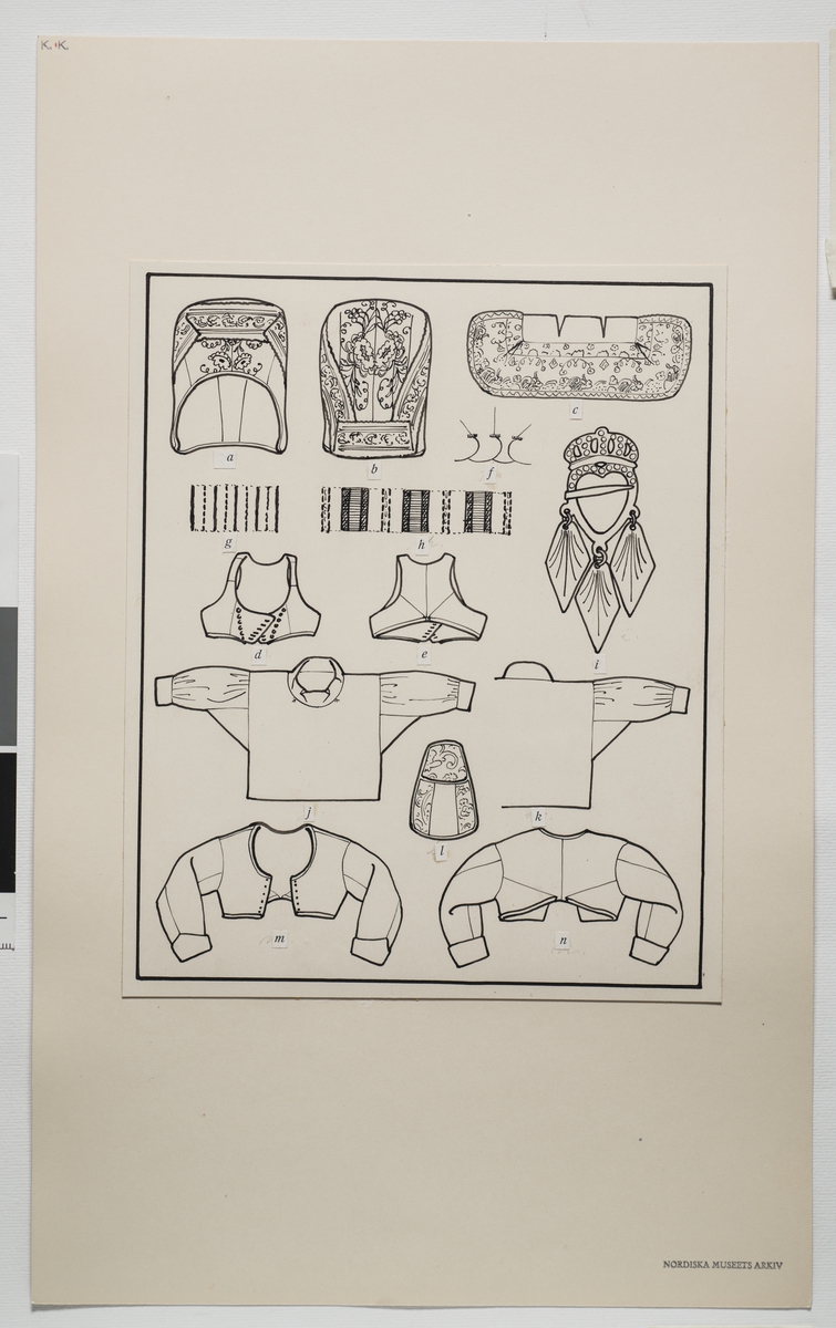 Helgdagsdräkt för gift kvinna, Häverö socken, Uppland. Teckning av Emelie von Walterstorff.