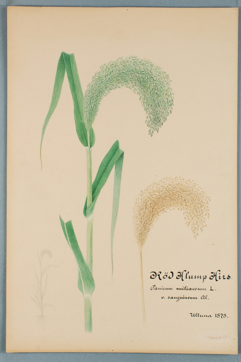 Sveriges kulturväxter. Illustration utförd av Henriette Sjöberg. Hirs, röd Klumphirs. Odlad Ultuna 1878.