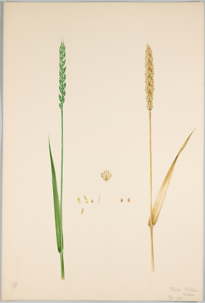 Sveriges kulturväxter. Illustration utförd av Henriette Sjöberg. Vete. Påskrift med blyerts på framsidan "Heines Kolben Weizen 31/8 1893.". Troligen odlat Experimentalfältet. I Kungliga Skogs och Lantbruksakademiens (KSLA) bibliotek (stämplad på baksidan). Signerad "H.S. 1893. Exp.".