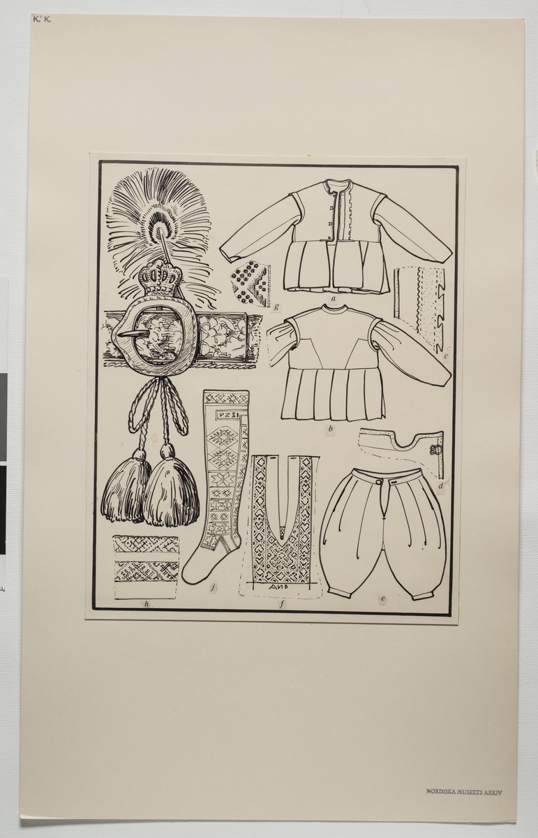 Högtidsdräkt, Ingelstads härad, Skåne. Teckning av Emelie von Walterstorff. Kvinnodräkt.