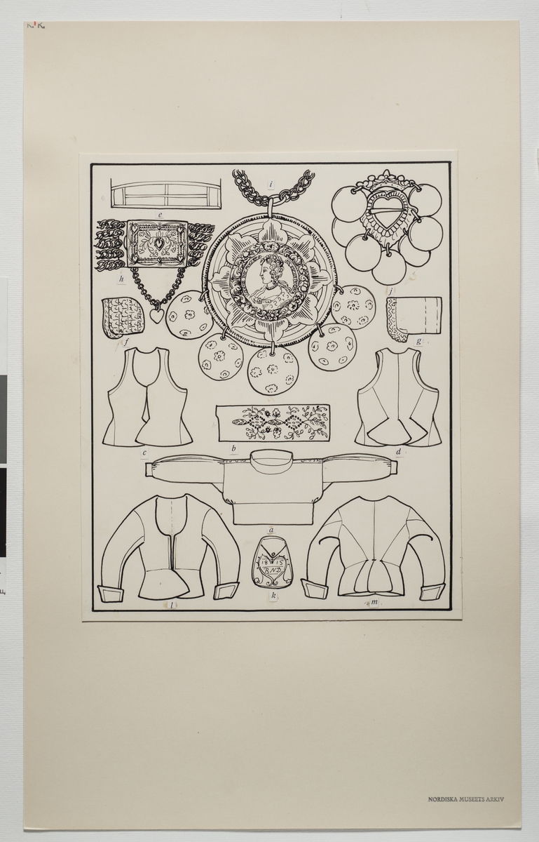 Festdräkt för gift kvinna Unnaryds socken, Västbo härad, Småland. Teckning av Emelie von Walterstorff.
