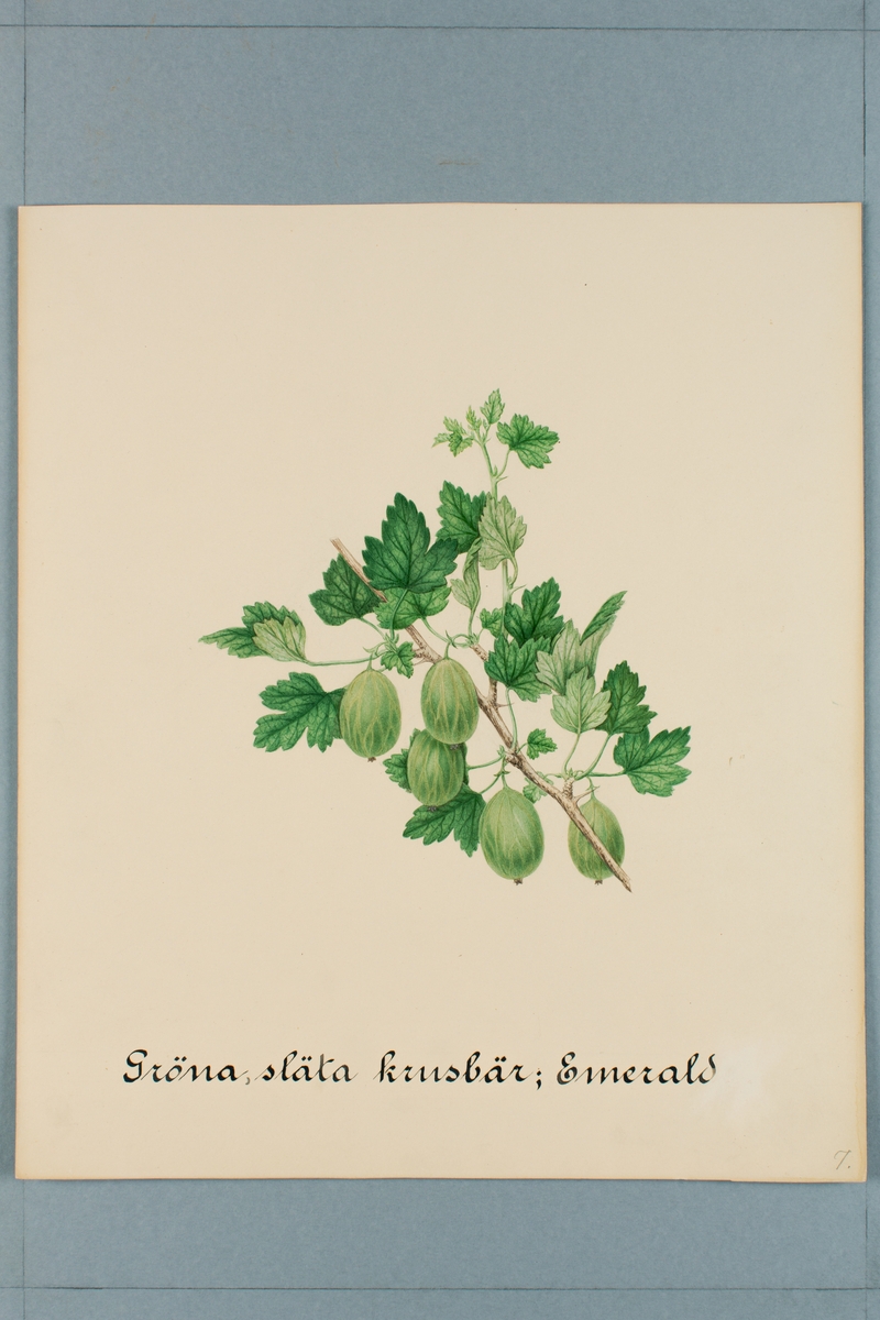 Sveriges kulturväxter. Illustration utförd av Henriette Sjöberg. Krusbär, gröna, släta, Emerald. Odlingsplats och datering saknas.