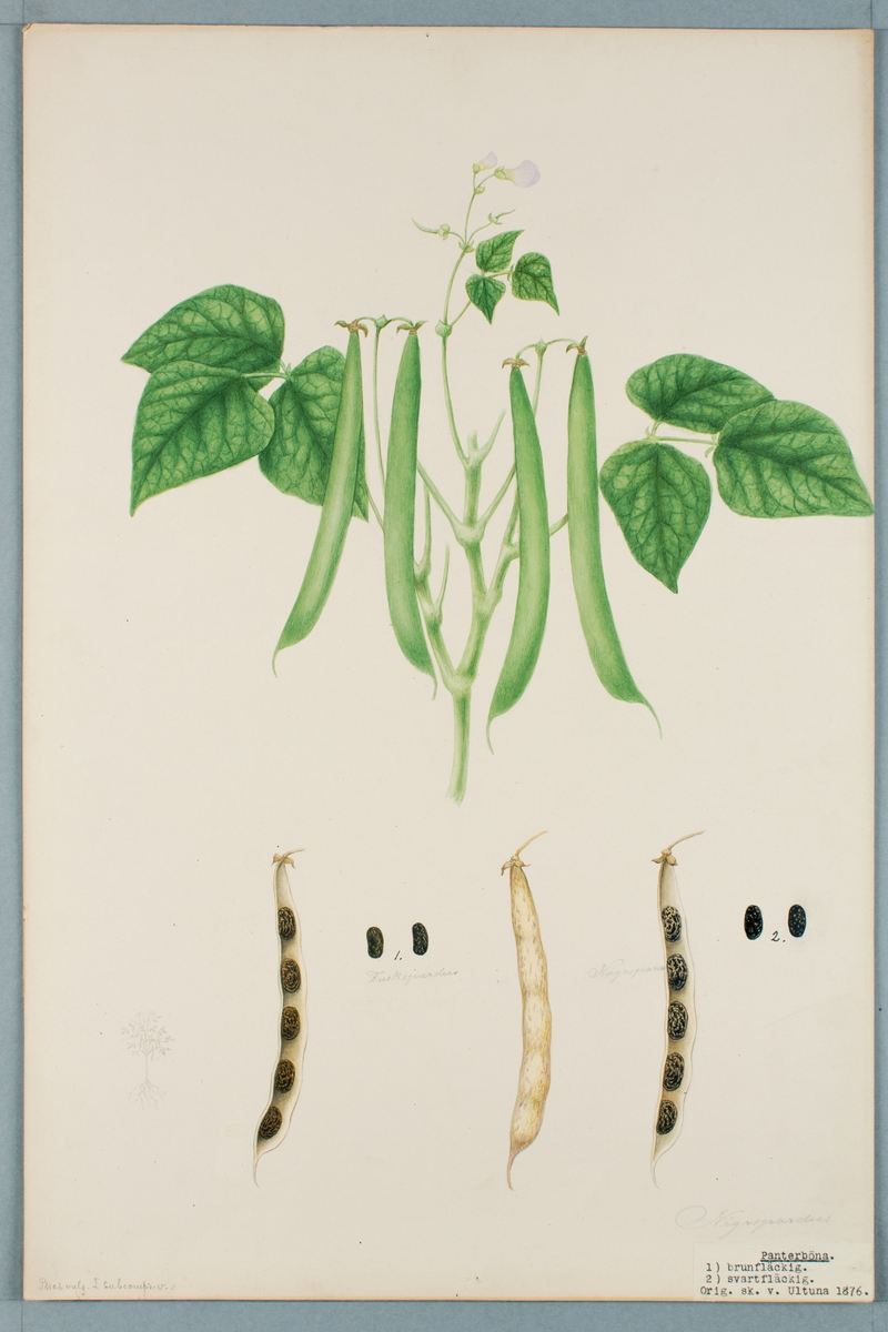 Sveriges kulturväxter. Illustration utförd av Henriette Sjöberg. Panterböna, a. brunfläckig, b. svartfläckig. Odlad Ultuna 1876. Inv. nr. C101 : 465.