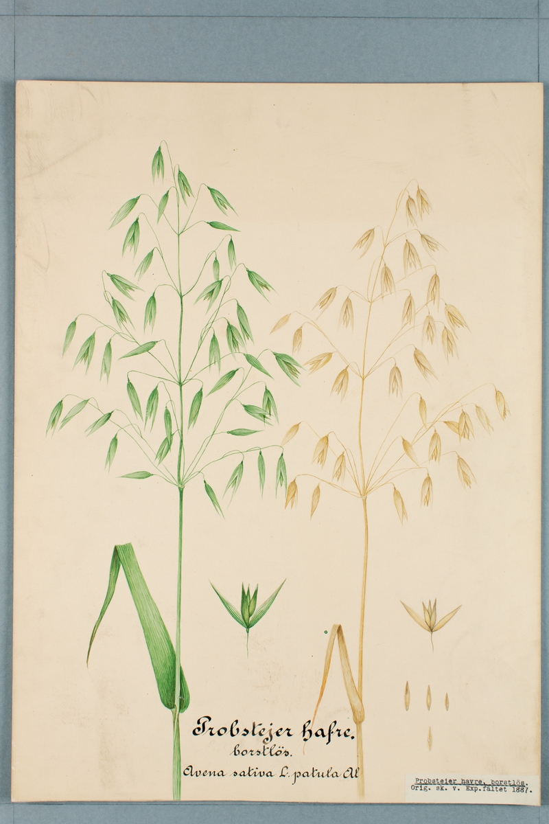Sveriges kulturväxter. Illustration utförd av Henriette Sjöberg. Havre, Probsteier, borstlös. Odlad Experimentalfältet 1887. Inv. nr. C101 : 203. Signerad "Henriette S..g 1887. Exper fälte.".