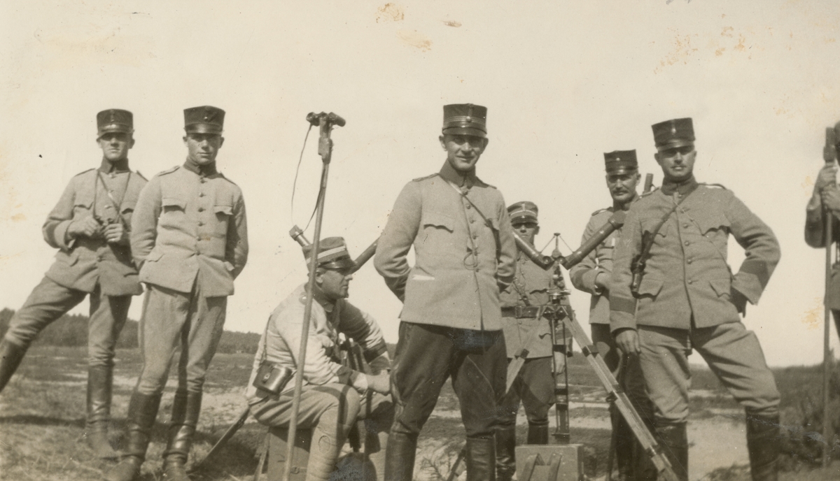 Titel: En grupp med soldater från Positionsartilleriregemente A 9 med avståndsmätare.