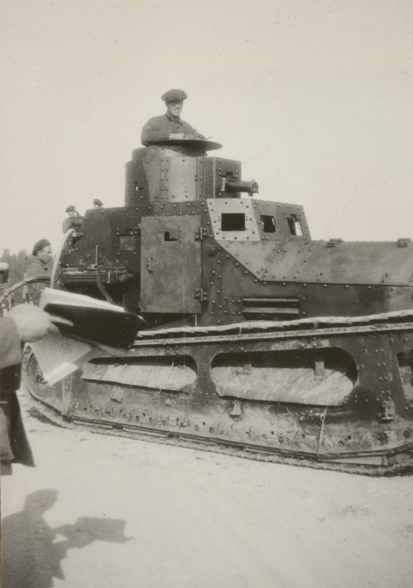 Titel: Stridsvagn m/1921 (eller 1921-1929) med löjtnant Gunnar Asklin från Bohusläns regemente I 17 i tornet.