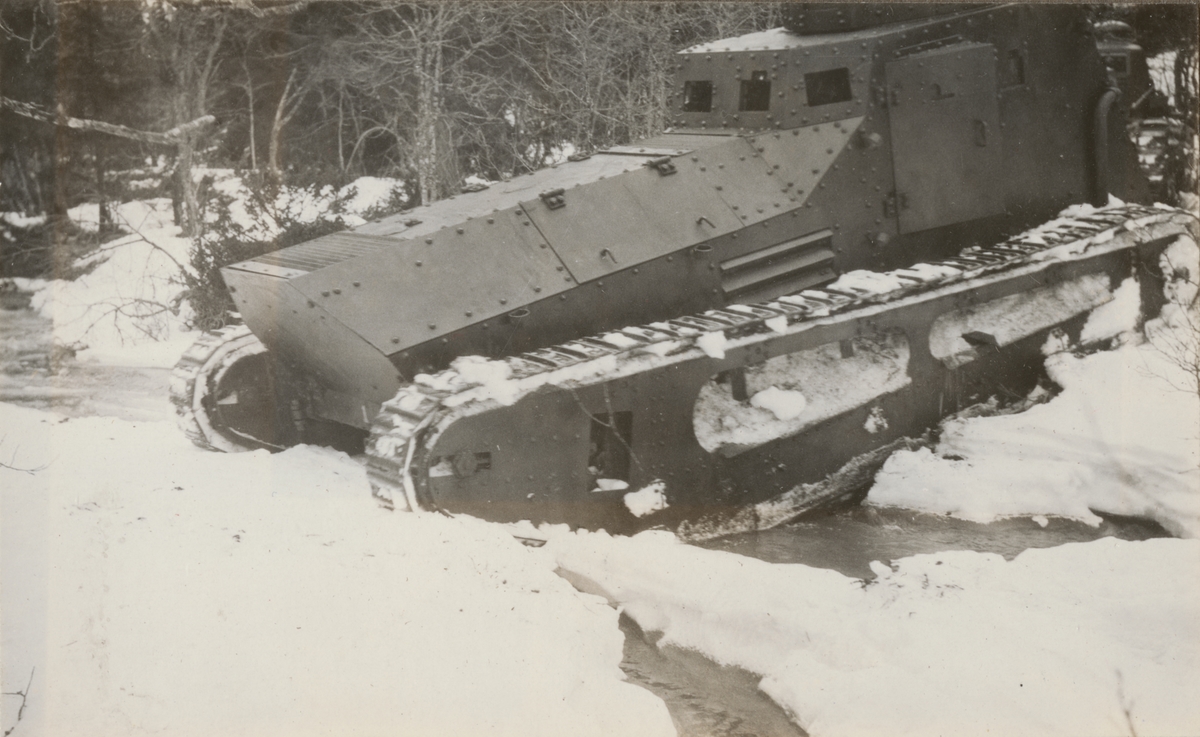 Titel: Vinterövning med stridsvagn m/1921 (eller m/1921-1929). Stridsvagnen korsar ett mindre vattendrag.