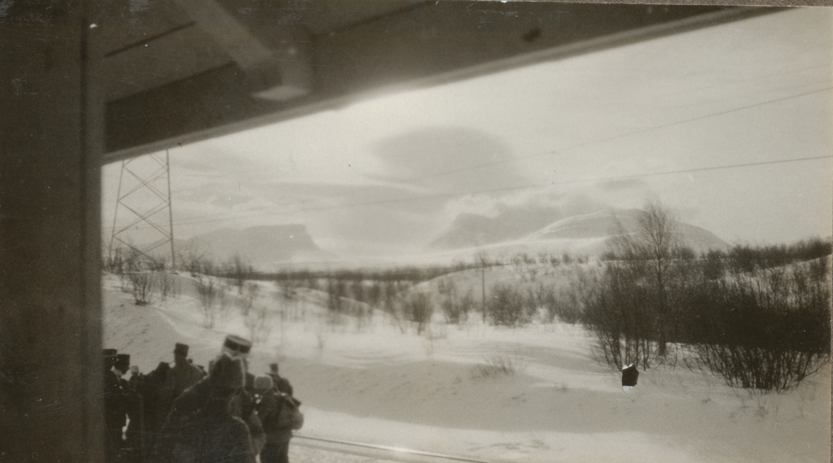 Fjällandskap vid Abisko med elever från stridsvagnskursen vid Göta livgardes stridsvagnsbataljon år 1928-1930 i förgrunden.