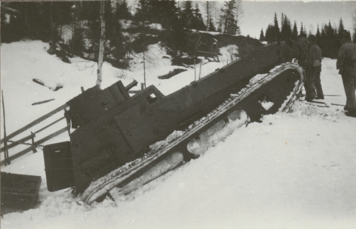 Stridsvagn m/1921 (eller m/1921-1929) körs upp till fjäll. Stridsvagnskursen vid Göta livgardes stridsvagnsbataljon övar i djupsnö vid Abisko.