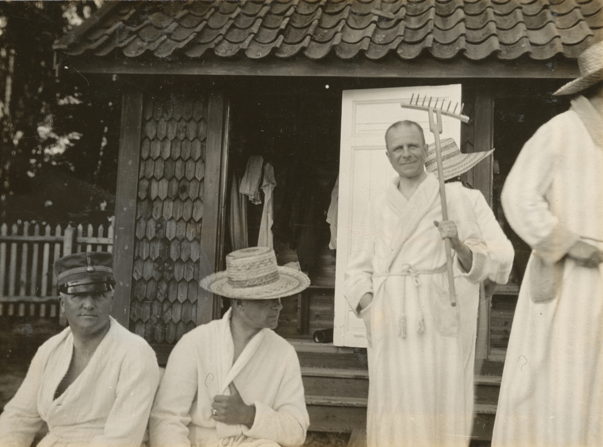 En grupp officerare i badrockar framför en byggnad. Från vänster sittandes kapten Curt Klingspor Svea livgarde I 1 bredvid en okänd officerare. Till höger står kapten Gösta Bratt Hallands regemente I 16 med en kratta på axel.