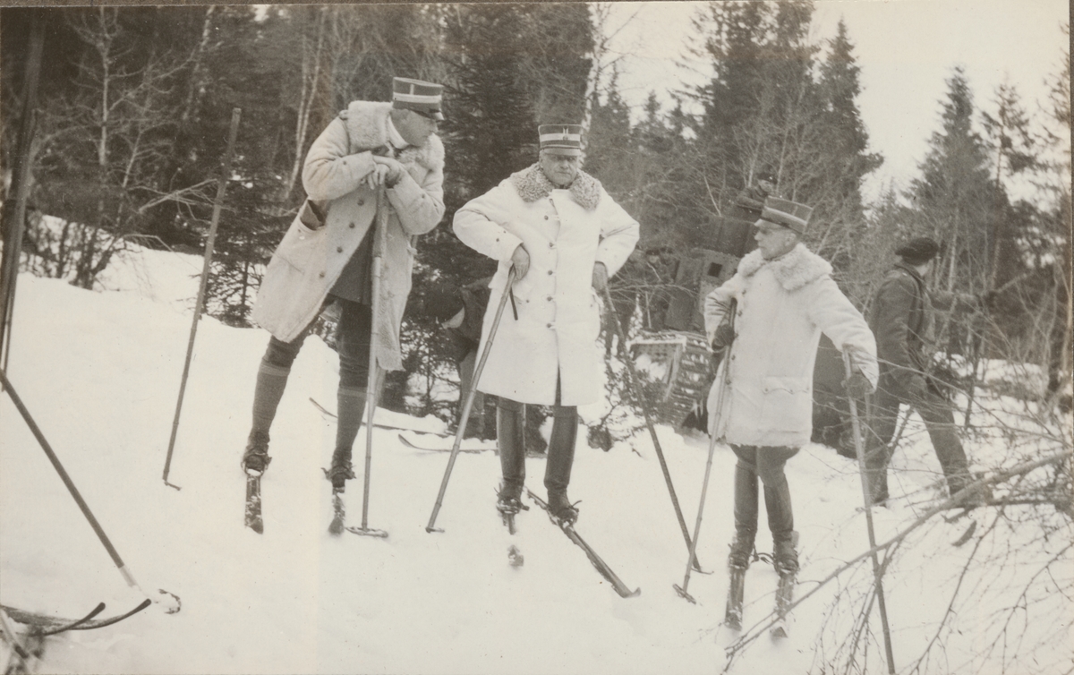 Officerare på skidor framför en stridsvagn m/1921 (eller 1921-1929). En soldat i bakgrunden visar vägen för stridsvagnen.