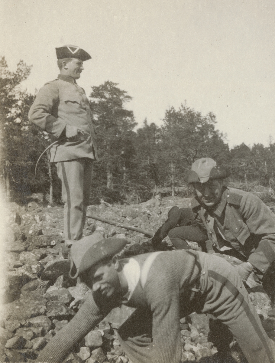 Titel: Officerare vid Göta livgarde bevakar soldater som arbetar med att förflytta stenar.