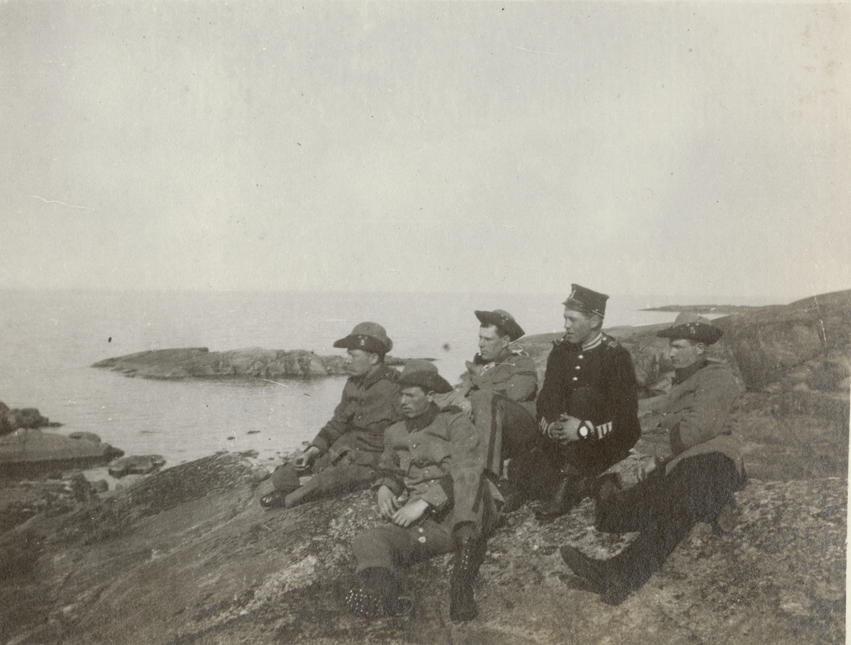 Titel: Gruppbild av soldater från Göta livgarde I 2 på stranden.
