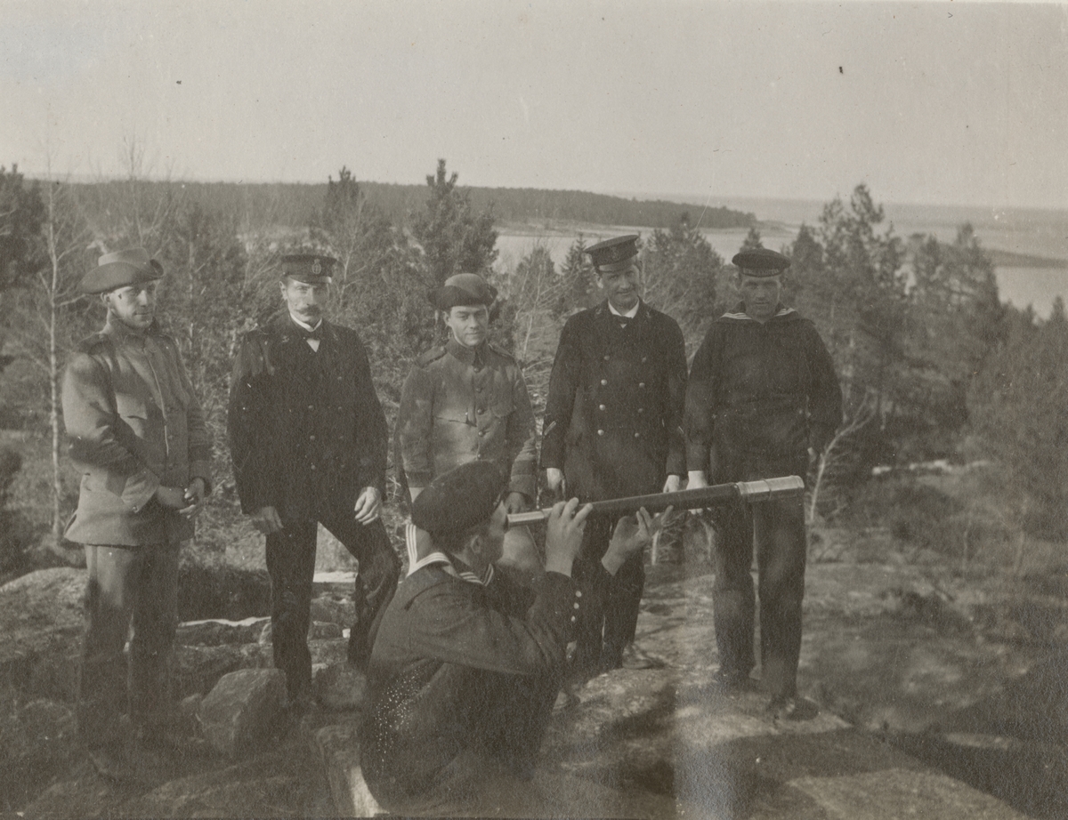 Titel: Soldater från Göta livgarde I 2 och från flottan vid en vaktpost på berget.