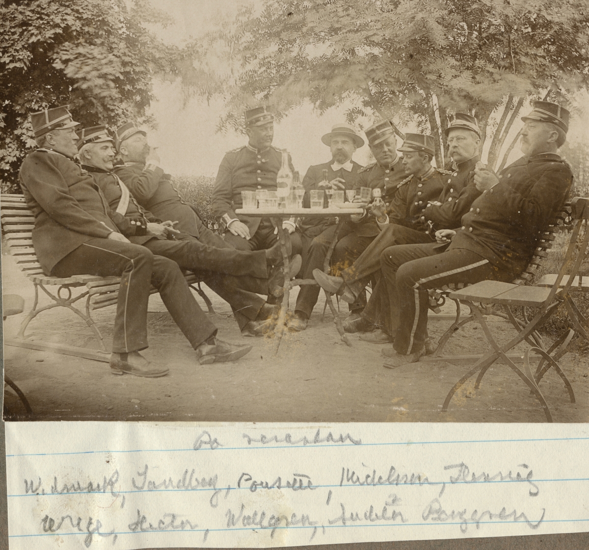 Officerare från Hälsinge regemente samlade kring bord i trädgården. Från vänster, enligt bildtexten: Widmark, Sandberg, Pousette, Michelson, Hennig, Unge, Hector, Wallgren, Andeén (?), Berggren.
