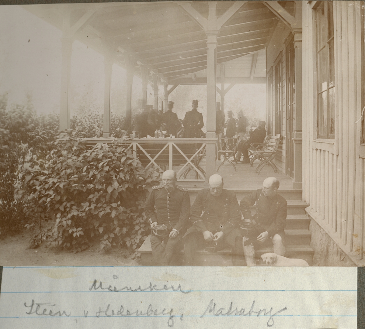 Titel: Tre officerare sitter på trappan till verandan vid Hälsinge regementes övningsplats Mohed.