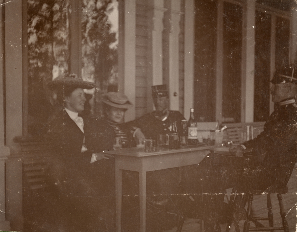 Titel: Sällskap avnjuter förfriskningar på veranda.