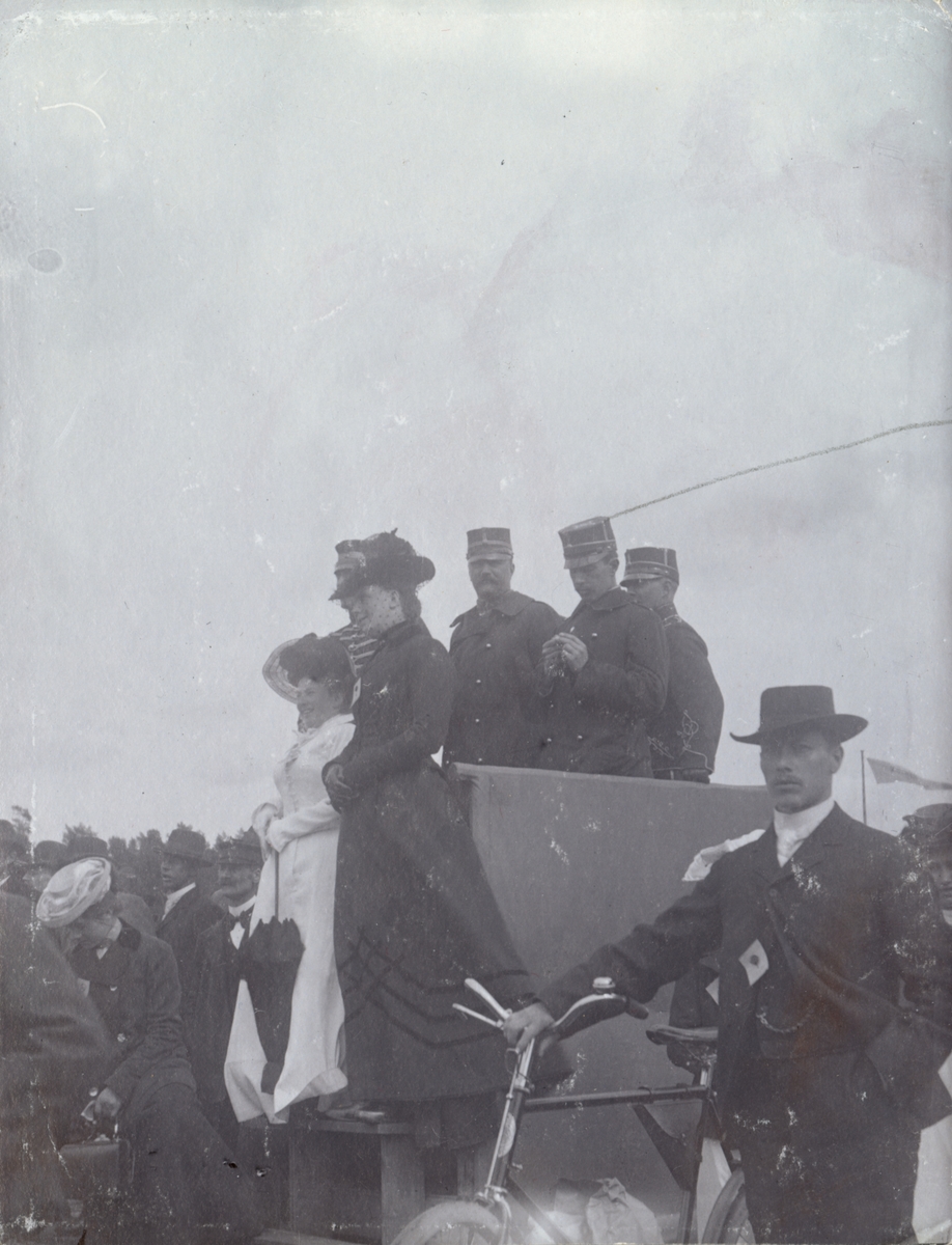Titel: Text i fotoalbum: "Ränneslätt K 4 Kav. aspirantskola 1900". Samling av civila vid övningsplats.