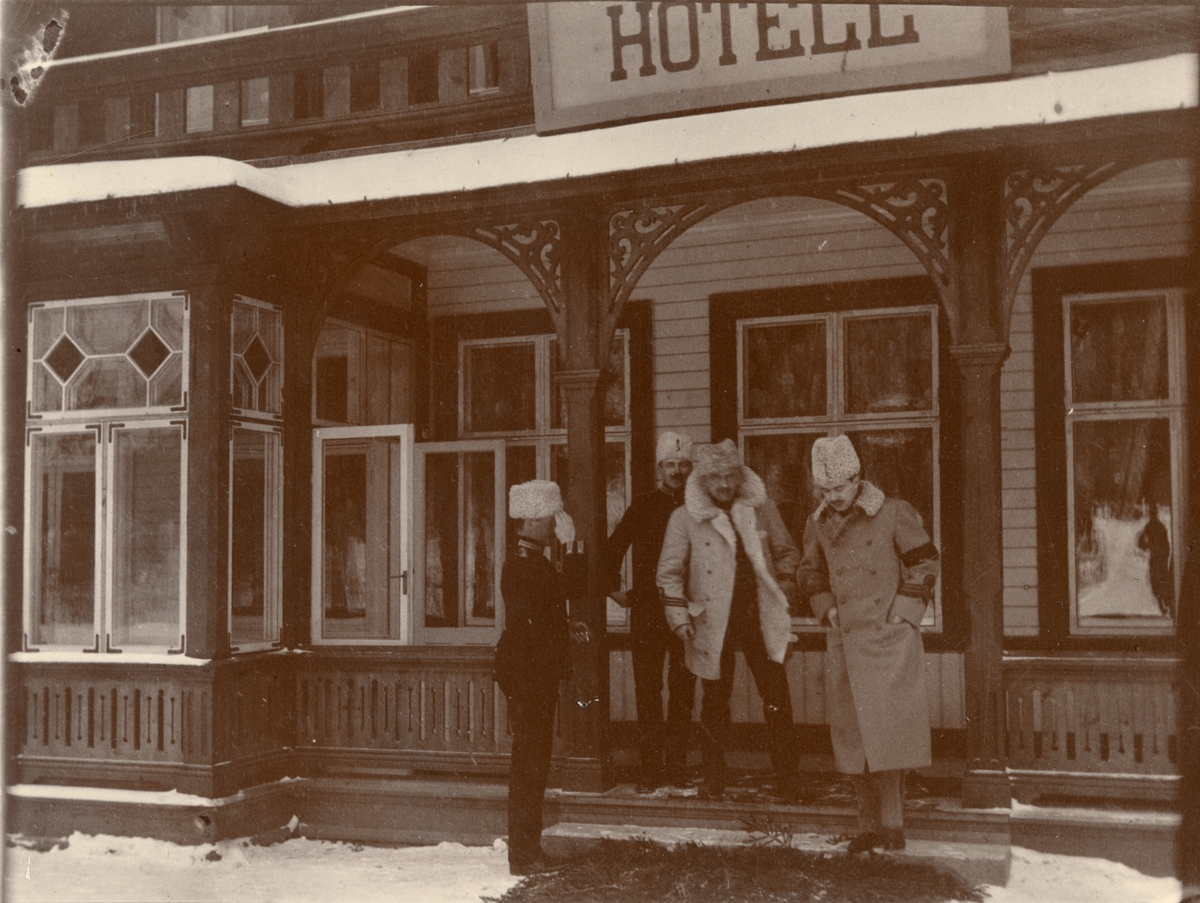 Titel: Officerare från Smålands husarregemente K 4 utanför hotell under vinterövning i Norrbotten omkring 1910.