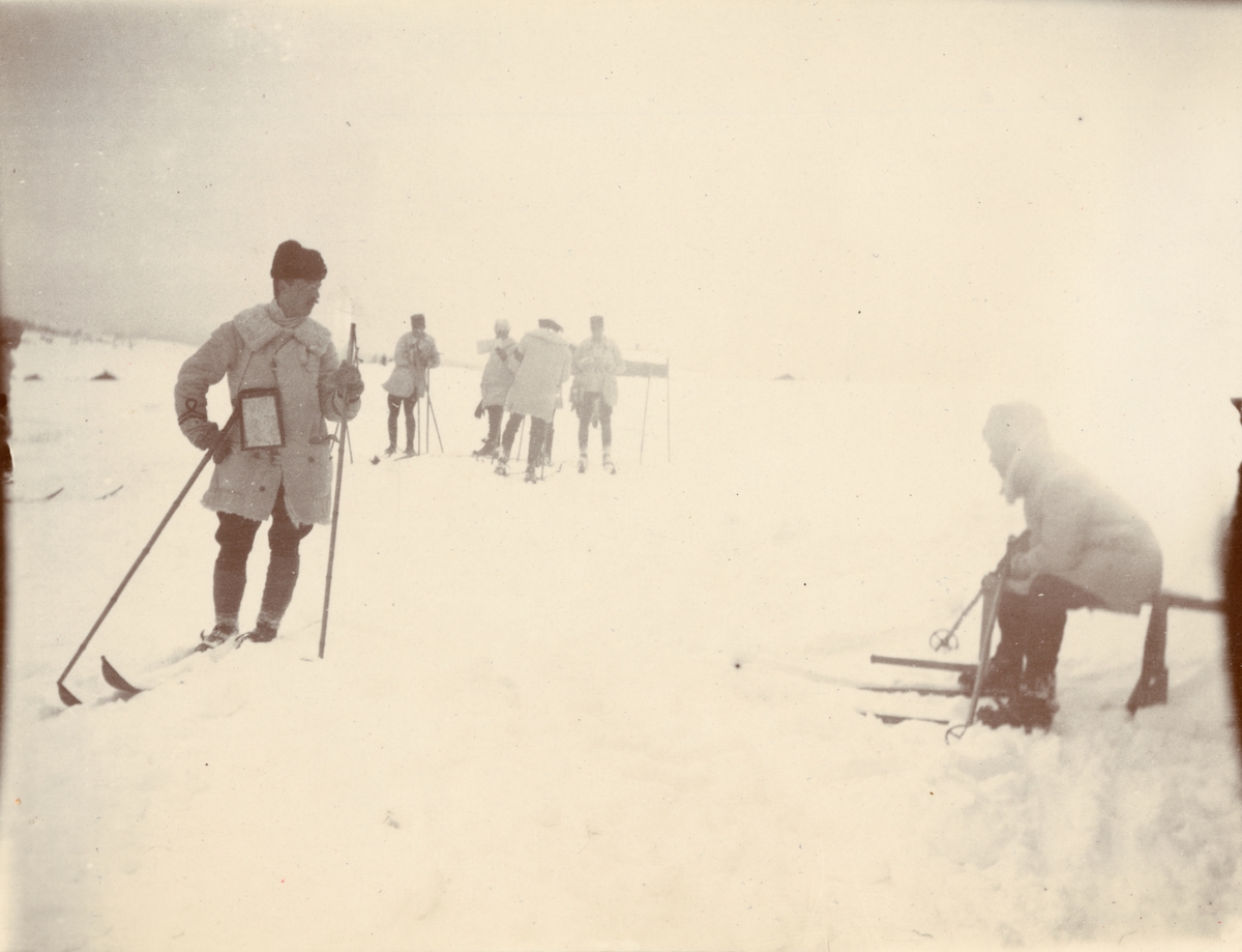 Smålands husarregemente K 4 på skidor, vinterövning i Norrbotten omkring 1910.