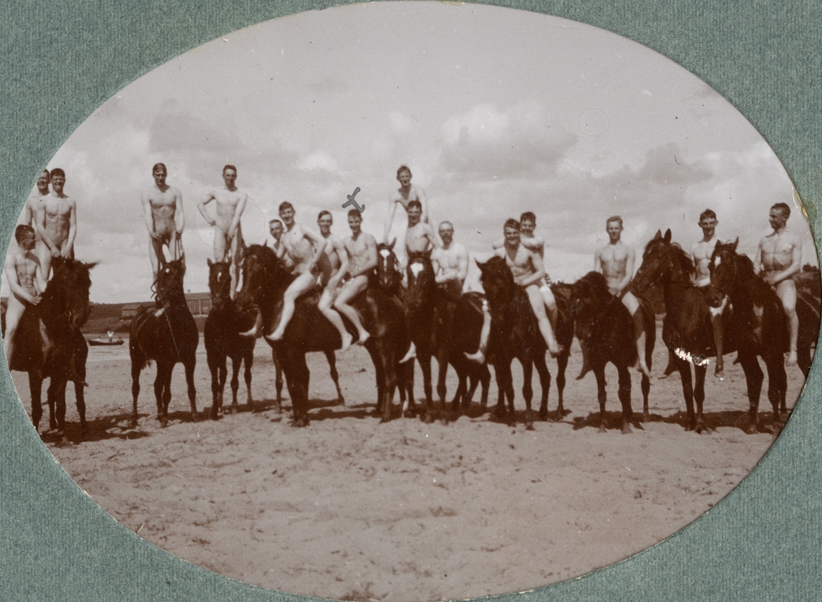 Titel: Gruppbild med soldater till hästar vid stranden.