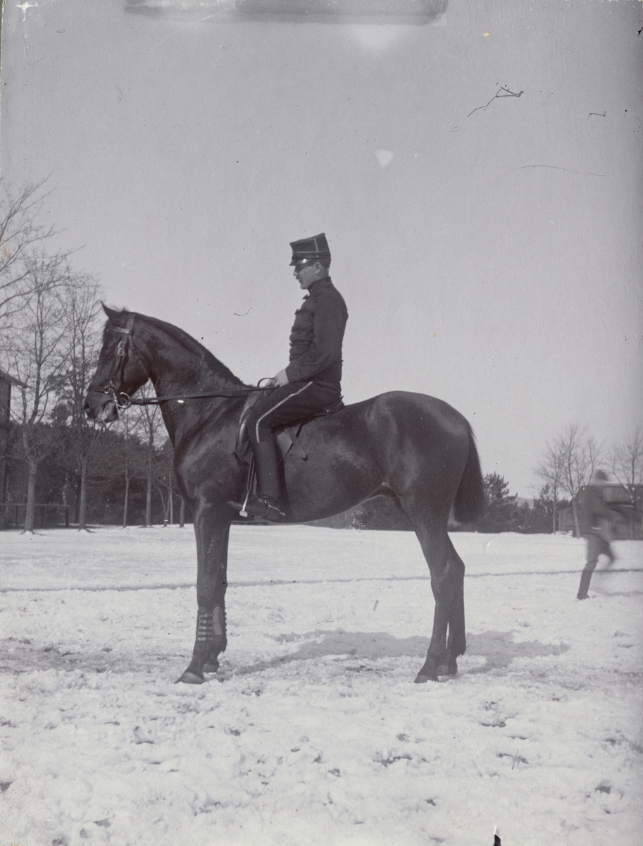 Titel: Text i fotoalbum: "Ränneslätt K 4 Kav. aspirantskola 1900". Soldat till häst.