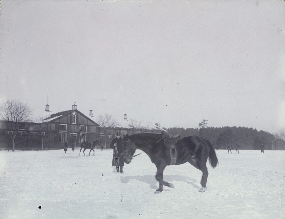 Titel: Text i fotoalbum: "Ränneslätt K 4 Kav. aspirantskola 1900". Hästar på övningsbana.