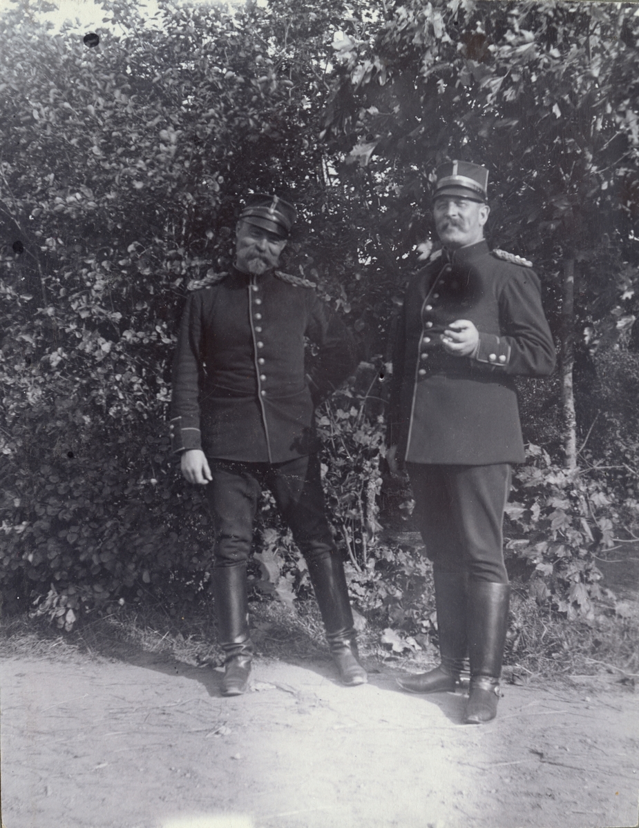 Titel: Text i fotoalbum: "Ränneslätt K 4 Kav. aspirantskola 1900". Tvä soldater vid häck.