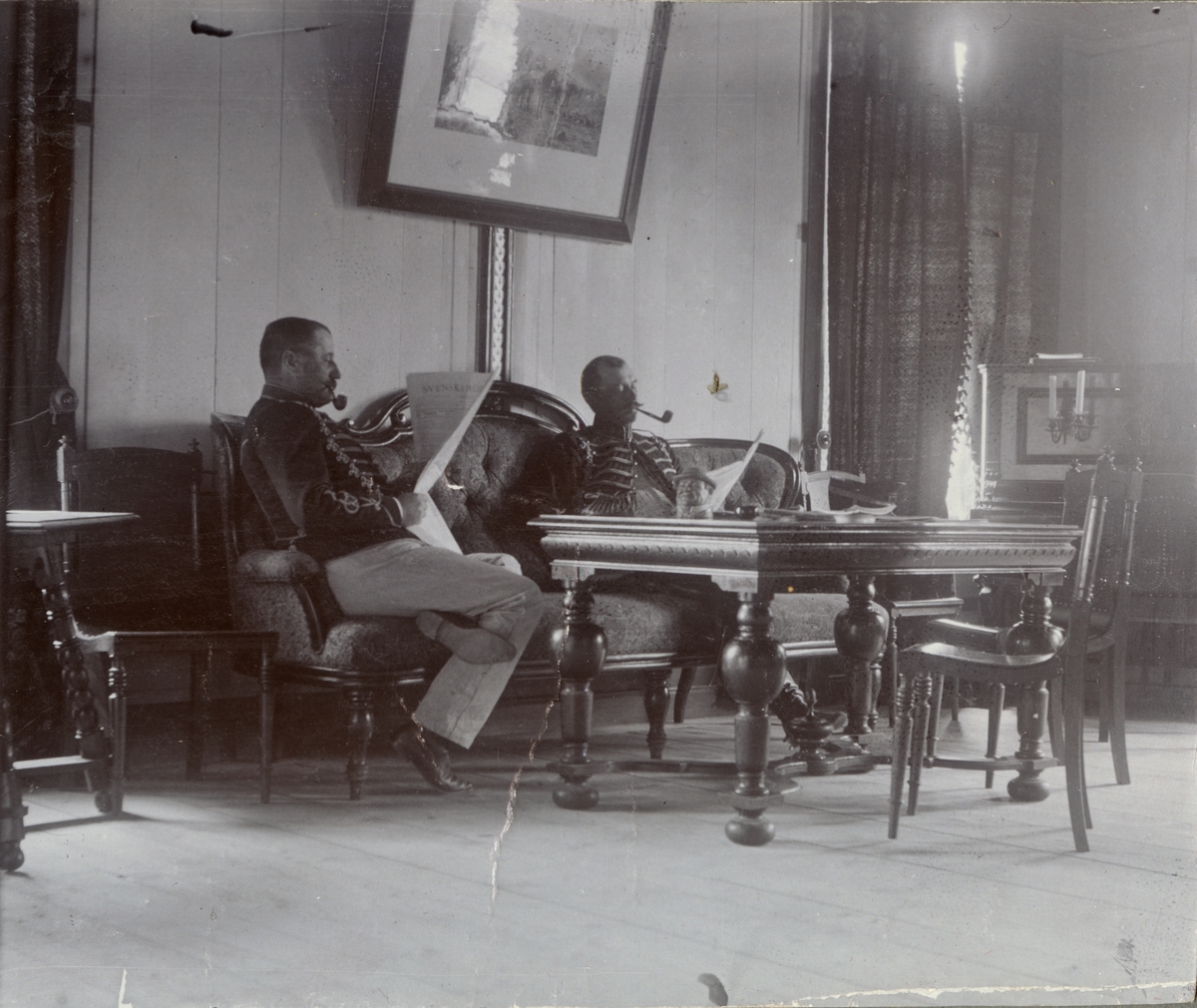 Titel: Text i fotoalbum: "Ränneslätt K 4 Kav. aspirantskola 1900". Soldater i mäss.