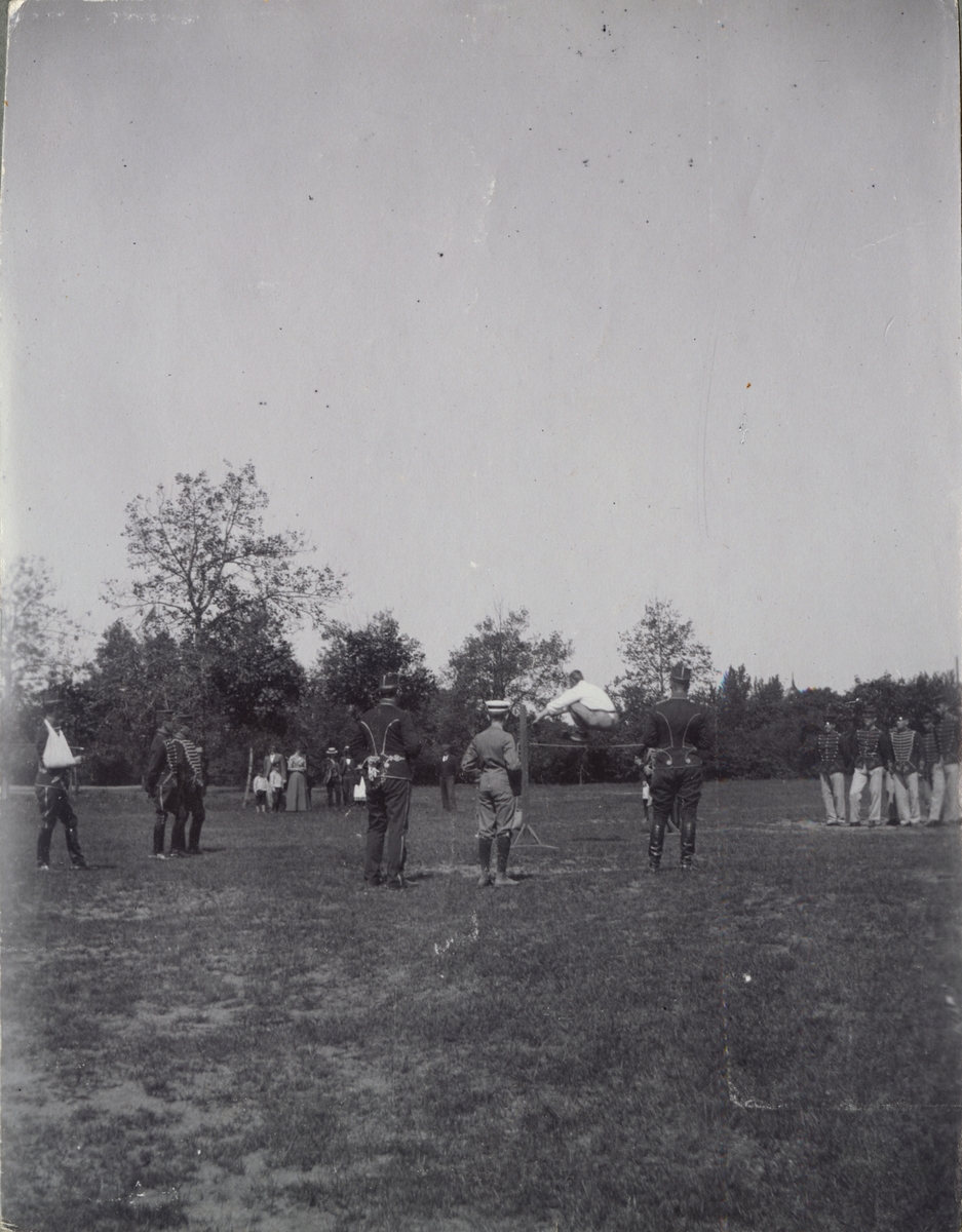 Titel: Text i fotoalbum: "Ränneslätt K 4 Kav. aspirantskola 1900". Höjdhopp på övningsfält.